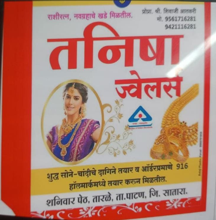 तारळे शहरातील सुप्रसिद्ध ज्वेलर्स.चांदीचे आकर्षक आणि लेटेस्ट डिझाईन मधील दागिने तेही भरपूर व्हरायटीमध्ये उपलब्ध आहेत सोन्या चांदीच्या दागिन्यांची भरपूर व्हरायटी आणि डिझाइन्स😍 हॉलमार्क प्रमाणित सुवर्ण खरेदीसाठी विश्वसनीय सुवर्णपेढी सर्व दागिने हॉलमार्क 91.6 चे मिळतील,येथे huid हॉलमार्क दागिने उपलब्ध सक्षम कारागीर व अत्याधुनिक यंत्रणेने सज्ज