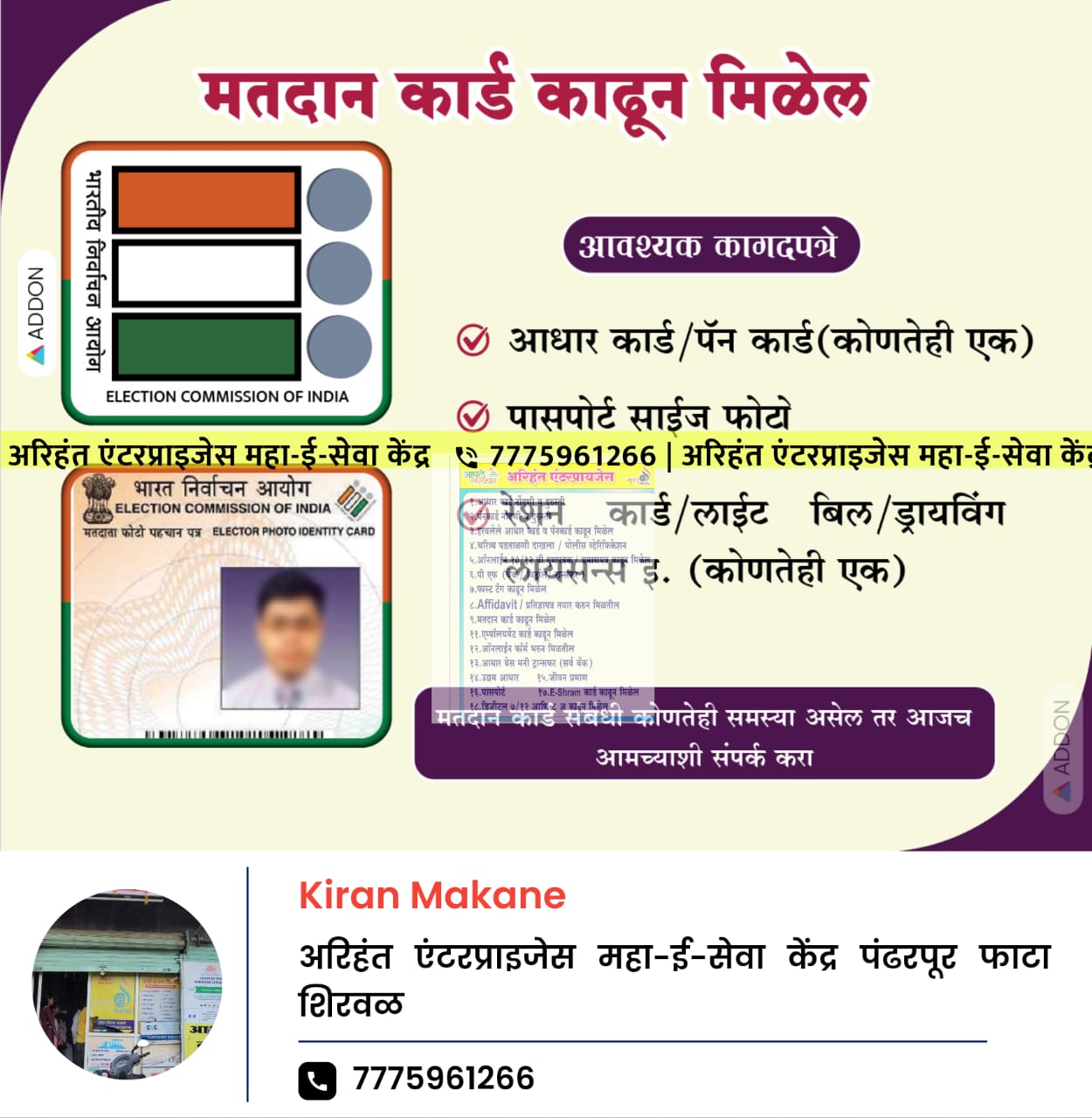 рдЖрдордЪреНрдпрд╛рдХрдбреЗ рдЦрд╛рд▓реАрд▓ рдкреНрд░рдорд╛рдгреЗ рдХрд╛рдореЗ рдХреЗрд▓реА рдЬрд╛рддрд╛рдд .Business Name: рдХрд┐рд░рдг рдорд╛рдХрдгреЗ рдорд╣рд╛-рдИ-рд╕реЗрд╡рд╛ рдХреЗрдВрджреНрд░ рдЕрд░рд┐рд╣рдВрдд рдПрдВрдЯрд░рдкреНрд░рд╛рдЗрдЬреЗрд╕ рд╢рд┐рд░рд╡рд│ Nature Of Business: Online Seva kendra Our Specialities рдорд╣рд╛-рдИ-рд╕реЗрд╡рд╛ рдХреЗрдВрджреНрд░ рдЕрд░рд┐рд╣рдВрдд рдПрдВрдЯрд░рдкреНрд░рд╛рдЗрдЬреЗрд╕ рдорд╣рд╛-рдИ-рд╕реЗрд╡рд╛ рдХреЗрдВрджреНрд░ рд╣реЗ рдЖрдкрд▓реНрдпрд╛ рд╕рд░реНрд╡ рд╕рд░рдХрд╛рд░реА рдХрд╛рдЧрджрдкрддреНрд░реЗ рдЖрдгрд┐ рдкреНрд░рдорд╛рдгрдкрддреНрд░рд╛рдВрд╕рд╛рдареА рдПрдХ рд╡рд┐рд╢реНрд╡рд╛рд╕рд╛рд░реНрд╣ рд╡ рд╕рдВрдкреВрд░реНрдг рд╕реЗрд╡рд╛ рдкреБрд░рд╡рдард╛ рдХрд░рдгрд╛рд░реЗ рдХреЗрдВрджреНрд░ рдЖрд╣реЗ. рдЖрдордЪрд╛ рдЙрджреНрджреЗрд╢ рдореНрд╣рдгрдЬреЗ рдирд╛рдЧрд░рд┐рдХрд╛рдВрдирд╛ рд╕рд╣рдЬ, рдЬрд▓рдж рд╡ рдЕрдЪреВрдХ рд╕реЗрд╡рд╛ рдкреБрд░рд╡рдгреЗ, рдЬреЗрдгреЗрдХрд░реВрди рд╡реЗрд│реЗрдЪреА рдЖрдгрд┐ рд╢реНрд░рдорд╛рдВрдЪреА рдмрдЪрдд рд╣реЛрдИрд▓. рдЖрдордЪреНрдпрд╛ рд╕реЗрд╡рд╛: рдирд╡реАрди рдЖрдзрд╛рд░ рдХрд╛рд░реНрдб рдХрд╛рдврдгреЗ рдЖрдзрд╛рд░ рдЕрдкрдбреЗрдЯ рдирд╛рд╡ рдЪреЗрдВрдЬ рдЬрдиреНрдо рддрд╛рд░реАрдЦ рдореЛрдмрд╛рдИрд▓ рдирдВрдмрд░ рд▓рд┐рдВрдХ рдХрд░рдгреЗ,рд╣рд░рд╡рд▓реЗрд▓реЗ рдЖрдзрд╛рд░ рдХрд╛рд░реНрдб рдХрд╛рдврдгреЗ рдУрд│рдЦрдкрддреНрд░реЗ рд╡ рдкреНрд░рдорд╛рдгрдкрддреНрд░реЗ: рдкреЕрдирдХрд╛рд░реНрдб, рдЖрдзрд╛рд░рдХрд╛рд░реНрдб, рдорддрджрд╛рди рдУрд│рдЦрдкрддреНрд░, рдкрд╛рд╕рдкреЛрд░реНрдЯ. рдЬрд╛рдд рдкрдбрддрд╛рд│рдгреА, рдбреЛрдорд┐рд╕рд╛рдИрд▓ рджрд╛рдЦрд▓рд╛, рдЙрддреНрдкрдиреНрдирд╛рдЪрд╛ рджрд╛рдЦрд▓рд╛, рдиреЙрди рдХреНрд░рд┐рдорд┐рд▓реЗрдЕрд░ рдкреНрд░рдорд╛рдгрдкрддреНрд░.рд╕рд░реНрд╡ рдЬрд╛рддреАрдВрдЪреЗ рджрд╛рдЦрд▓реЗрдЕрд▓реНрдкрднреВрдзрд╛рд░рдХ/рд╢реЗрддрдХрд░реА рджрд╛рдЦрд▓рд╛, EWS рджрд╛рдЦрд▓рд╛. рдиреЛрдВрджрдгреА рд╡ рдкрд░рд╡рд╛рдиреЗ: рдЙрджреНрдпреЛрдЧ рдЖрдзрд╛рд░, рд╢реЙрдк рдЕреЕрдХреНрдЯ, рд▓рд┐рдХрд░ рд▓рд╛рдпрд╕рдиреНрд╕, рдЕрдиреНрдирднреЗрд╕рд│ рдкрд░рд╡рд╛рдирд╛. рдЪрд╛рд░рд┐рддреНрд░реНрдп рдкрдбрддрд╛рд│рдгреА рджрд╛рдЦрд▓рд╛, рднрд╛рдбреЗрдХрд░рд╛рд░ рд╢реЗрддреА рд╡ рдорд╛рд▓рдорддреНрддрд╛ рд╕рдВрдмрдВрдзрд┐рдд рд╕реЗрд╡рд╛: рдСрдирд▓рд╛рдИрди рен/резреи, рдлреЗрд░рдлрд╛рд░, рд╕рд┐рдЯреА рд╕рд╡реНрд╣реЗрдВ рдЙрддрд╛рд░рд╛, рдбреЛрдВрдЧрд░реА рджрд╛рдЦрд▓рд╛, рдХреГрд╖реА рд╡рд┐рднрд╛рдЧ рдСрдирд▓рд╛рдИрди рдлреЙрд░реНрдо, рдЗрддрд░: рдЧреЕрдЬреЗрдЯ, рдЕрдгреНрдгрд╛рд╕рд╛рд╣реЗрдм рдкрд╛рдЯреАрд▓ рдпреЛрдЬрдирд╛ рдлреЙрд░реНрдо, рдкреАрдПрдо рдХрд┐рд╕рд╛рди рдлреЙрд░реНрдо, рдЖрд░реНрдореА рд╕реНрдкрд░реНрд╢ рдкреЗрдиреНрд╢ рд╕рдВрдмрдВрдзрд┐ рд╕рд░реН рдХрд╛рдо рдЖрдордЪреНрдпрд╛ рд╕реЗрд╡реЗрдЪреА рд╡реИрд╢рд┐рд╖реНрдЯреНрдпреЗ: рддрддреНрдкрд░рддрд╛: рд╕рд░реНрд╡ рд╕реЗрд╡рд╛ рдЬрд▓рдж рд╡ рдЕрдЪреВрдХ рдкрджреНрдзрддреАрдиреЗ рдЙрдкрд▓рдмреНрдз. рд╡рд┐рд╢реНрд╡рд╛рд╕рд╛рд░реНрд╣рддрд╛: рдЕрдиреБрднрд╡рд╕рдВрдкрдиреНрди рд╡ рдкреНрд░рд╢рд┐рдХреНрд╖рд┐рдд рдХрд░реНрдордЪрд╛рд░реА. рдЧре
