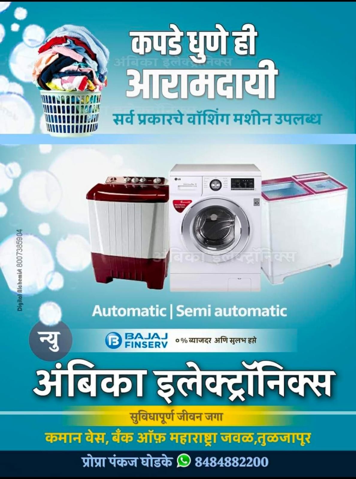 इलेक्ट्रॉनिक्स क्षेत्रातील तुळजापूर मधील खात्रीशीर ठिकाण म्हणजेच न्यू अंबिका इलेक्ट्रॉनिक्स. आमच्या कडे सर्व प्रकारच्या इलेक्ट्रॉनिक्स वस्तू ब्रांडेड कंपनीच्या खात्रीशीर योग्य व मापक दरात उपलब्ध आहेत. फ्रिज, वॉशिंग मशीन यांची विक्री व दुरुस्ती उपलब्ध आहे. घरपोच सेवा.
