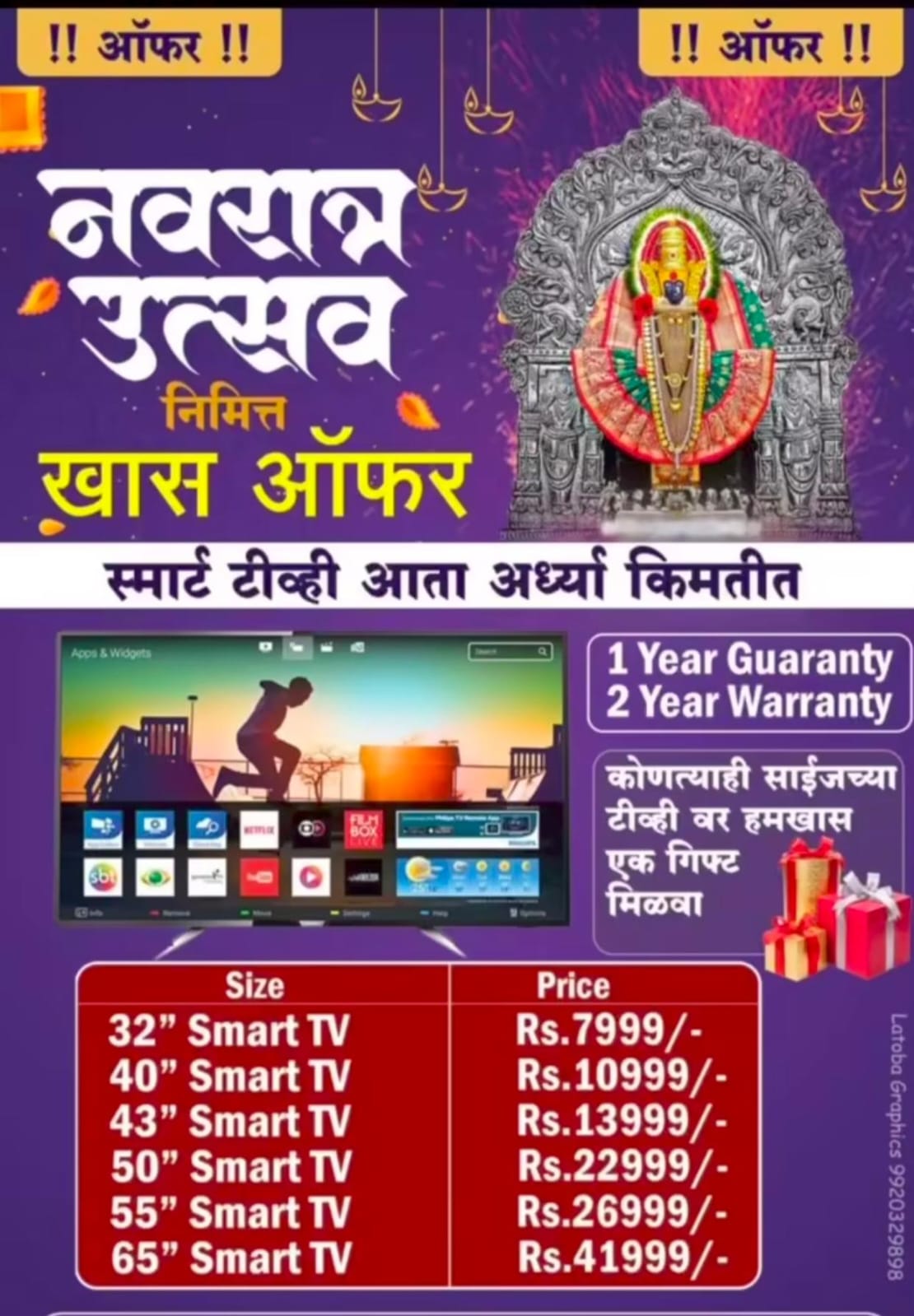 ग्राहकांसाठी खास दसरा व दिवाळी निमित्त भव्य exchange offer सुरू आहे. वॉशिंग मशीन, फ्रिज, कुलर, फिल्टर,led tv, गिझर, फॅन, d फ्रिज, चिमणी अशा सर्व प्रकारच्या ब्रँडेड नामांकित कंपन्यांच्या वस्तू उपलब्ध आमच्याकडे lg, godrej, bpl, samsung, sony, ifb, elica, bajaj अशा सर्व नामांकित कंपन्यांच्या इलेक्ट्रॉनिक्स वस्तू उपलब्ध. तसेच ग्राहकांसाठी bajaj finance, tvs finance, credit card या सुविधा उपलब्ध आहेत. """ उधारी चालू आहे.""" """ उधारी चालू आहे."""