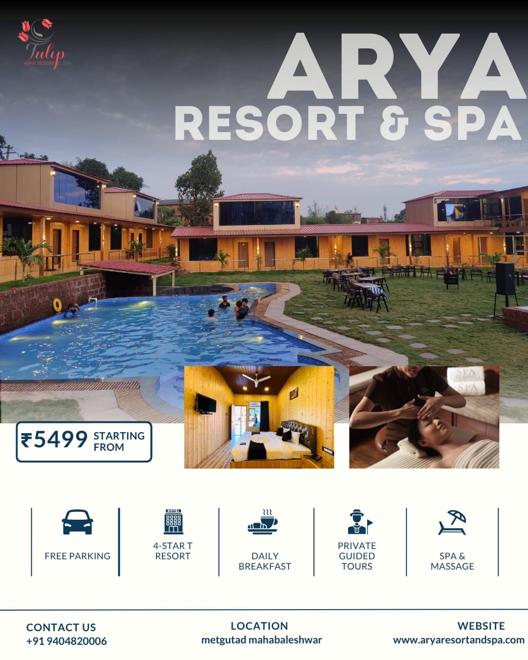 Modern amenities and comfortable rooms.Why Choose Hotel Arya Resort & Spa? Luxury resort in Met Gutad, Mahabaleshwar Ideal for honeymoon, family & group stays Peaceful location with scenic mountain views Modern amenities & comfortable rooms Easy access to Mahabaleshwar sightseeing spots Book your stay at Hotel Arya Resort & Spa, Mahabaleshwar and experience the perfect blend of nature, luxury, and relaxation.