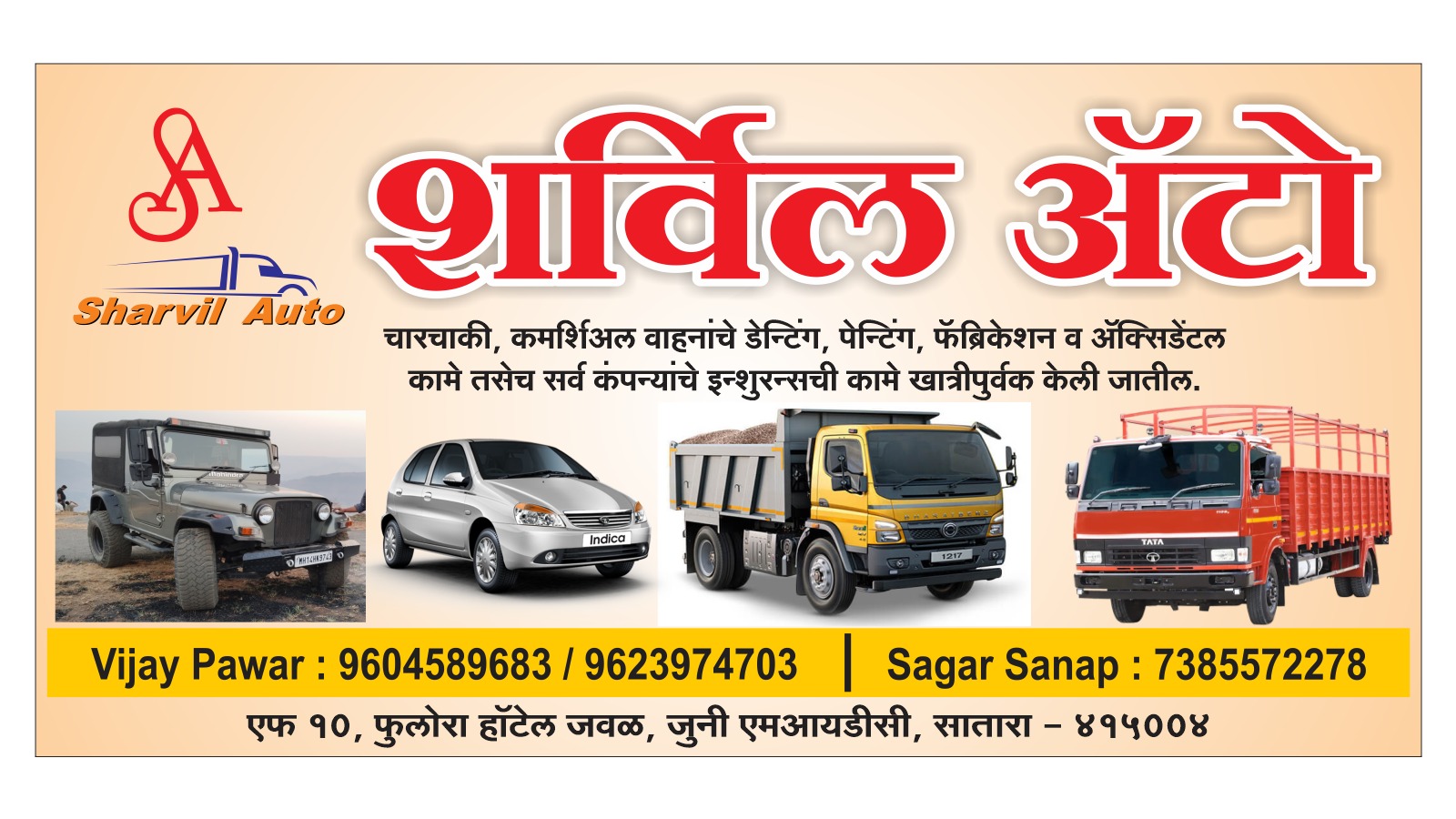 शर्विल ऑटोमध्ये चारचाकी आणि कमर्शियल वाहनांचे डेंटिंग, पेंटिंग, फॅब्रिकेशन तसेच अॅक्सिडेंट रिपेअरची सर्व कामे उच्च दर्जात आणि विश्वासाने केली जातात. अनुभवी तांत्रिक टीम व आधुनिक सुविधा यांच्या मदतीने वाहनाला नवीनसारखे रूप देण्याचे काम आम्ही अत्यंत काळजीपूर्वक करतो. तसेच सर्व प्रकारच्या कंपन्यांच्या इन्शुरन्स कामांची प्रक्रियाही येथे सहज आणि अचूकरीत्या पूर्ण केली जाते.