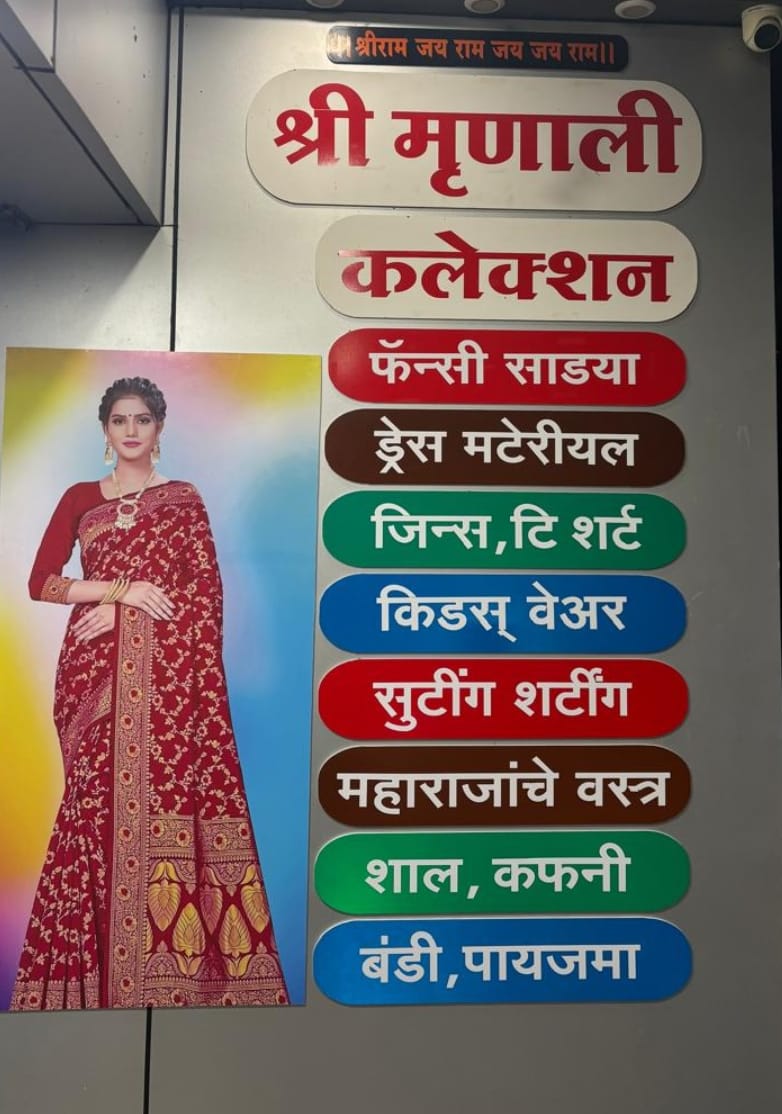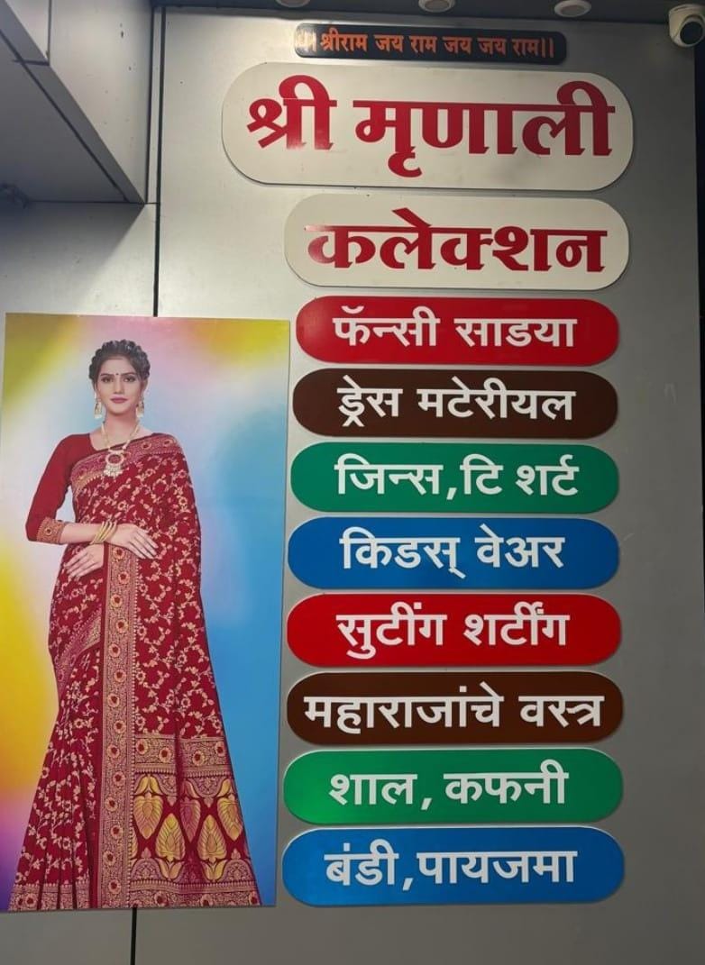 🥻🥼👕👖👔साडी ड्रेस मटेरियल अंडरगारमेंट्स रेडीमेड शर्ट पॅन्ट लेडीज टॉवेल आणि इतर सर्व काही एकाच छताखाली. 👕👖👔 ब्रँडेड आणि क्वालिटी मटेरियल. 👕👖👔 सणासुदीच्या खास ऑफर्स आणि सवलतीच्या दरामध्ये उपलब्ध. 🥻🥼👕लेटेस्ट डिझाईन आणि भरपूर व्हरायटी. 🥻🥼👕 विनम्र आणि तत्पर सेवा गोंदवलेकर महाराजांच्या सेवेकरांचे ड्रेस बंडी पायजमा योग्य दरात मिळतील. 🥼👕👖जेन्ट्स, लेडीज अँड किड्स कलेक्शन- मग वाट कसली पाहताय? येताय ना मृणाली कलेक्शन गोंदवले बु.!! एक वेळ अवश्य भेट द्या. मृणाली कलेक्शन्स ला भेट अथवा संपर्क केल्याबद्दल धन्यवाद.