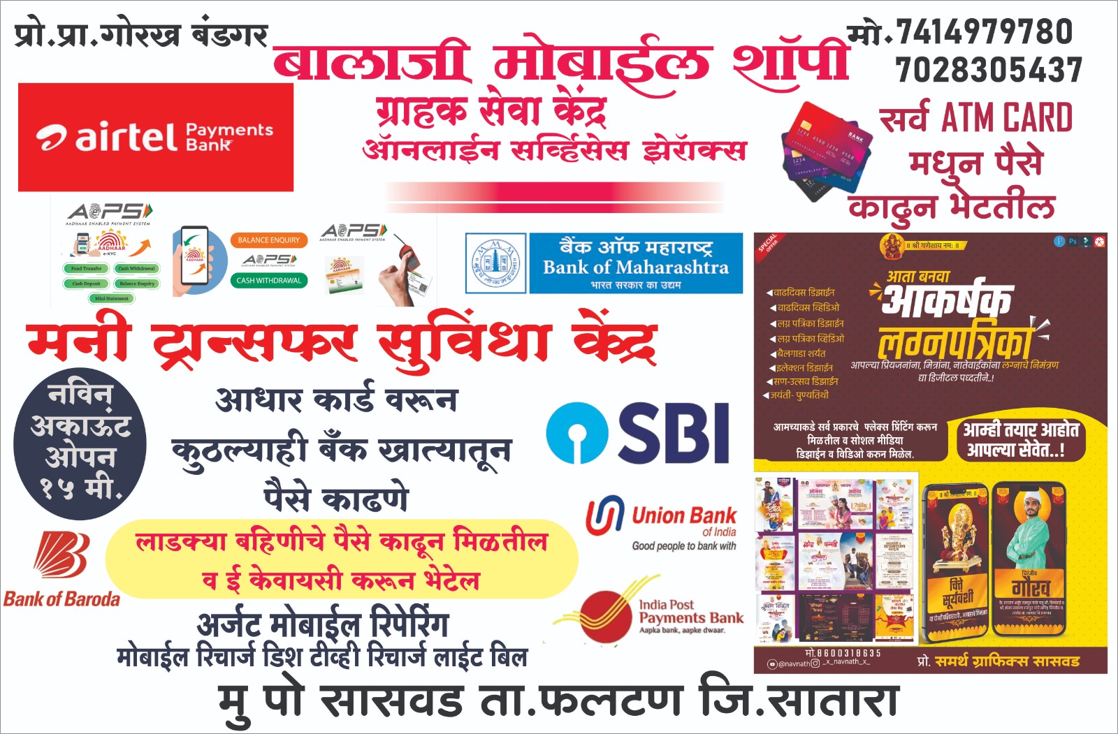 आमच्याकडे सर्व प्रकारचे मोबाईल सॉफ्टवेअर व हार्डवेअर ची कामे करून मिळतील Airtel Payment Bank नविन बँक अकाऊंट ओपन सवँ बँक 🏦 सुविधा उपलब्ध Apes आधार काडँ वरुन पैसे काढुन भेटतील 7028305437