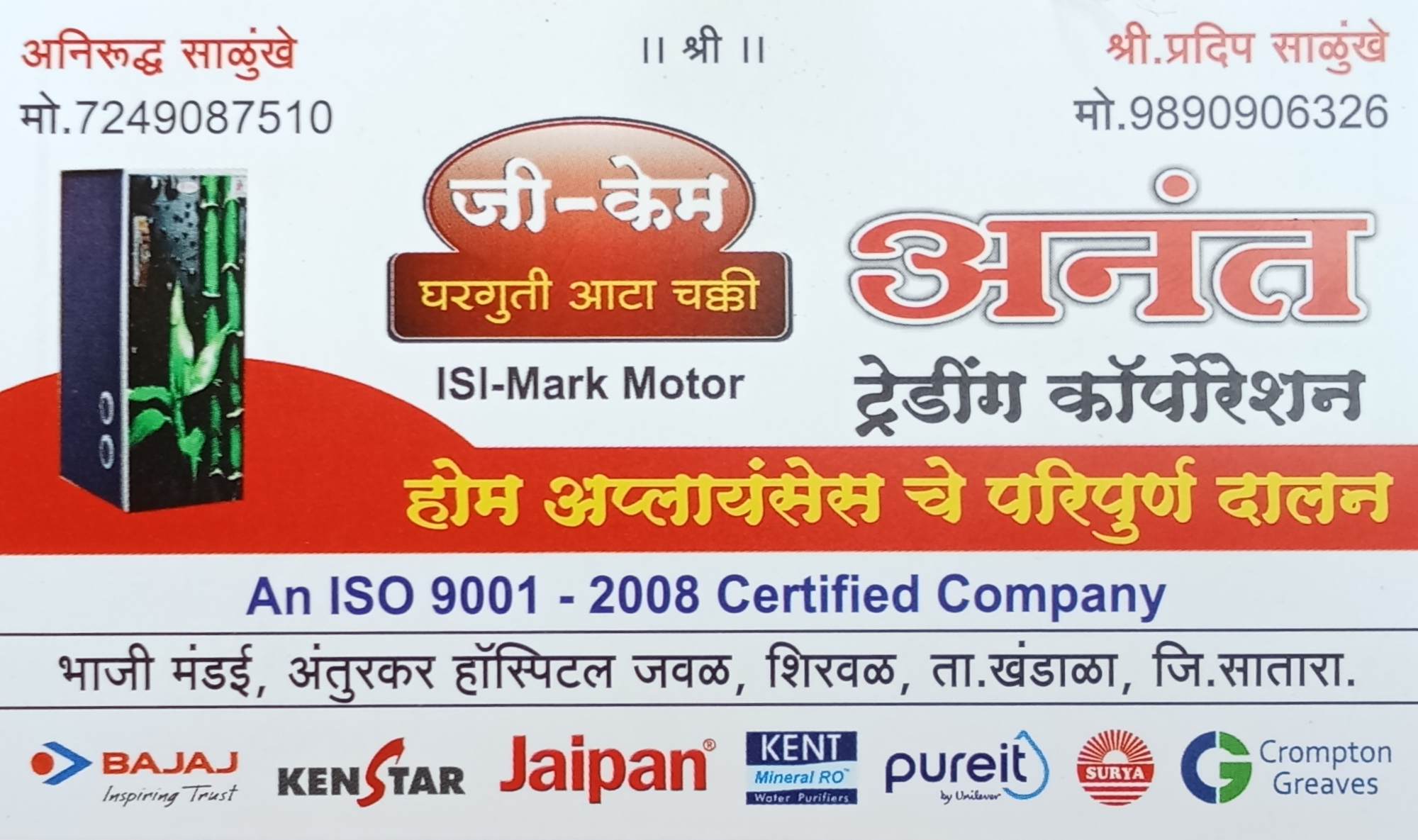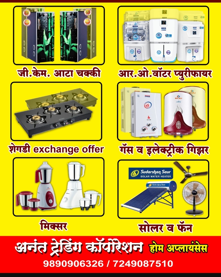 संपूर्ण तालुक्यामध्ये सुप्रसिद्ध अनंत ट्रेडिंग कार्पोरेशन होम अप्लायंसेस भाजी मंडई शिरवळ. 9890906326, 8329682084. पिठाची गिरण,फ्रिज,वॉशिंग मशिन,ए.सी., सोलर सिस्टिम, वॉटर प्युरिफायर, आर ओ, सिस्टीम, गॅस व इलेक्ट्रिक गिझर, मिक्सर ,फूड प्रोसेसर ,इंडक्शन शेगडी, रोटी मेकर, कुलर, फॅन, रूम हीटर,hp गॅस कनेक्शन, गॅस शेगडी, विक्री व दुरुस्ती.
