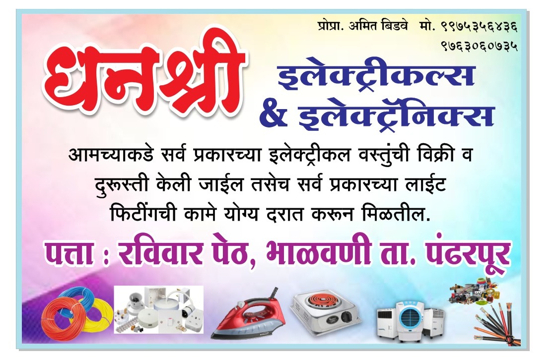 धनश्री इलेक्ट्रिकल्स अँड इलेक्ट्रॉनिक्स, प्रोप्रा. श्री अमित बिडवे. रविवार पेठ भाळवणी ता. पंढरपूर, जि. सोलापूर.