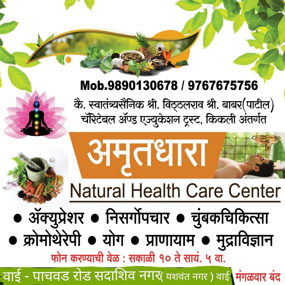 рдЕрдореГрддрдзрд╛рд░рд╛ рдиреЕрдЪрд░рд▓ рд╣реЗрд▓реНрдердХреЗрдЕрд░ рд╕реЗрдВрдЯрд░, рдпреЗрдереЗ рдПрдХреНрдпреВрдкреНрд░реЗрд╢рд░ ре▓рдХреНрдпреБрдкрдВрдХреНрдЪрд░ рдирд┐рд╕рд░реНрдЧреЛрдкрдЪрд╛рд░, рдпреЛрдЧрд╛, рд╡ рдмрд╛рд╣реНрдп рдЙрдкрдЪрд╛рд░ рдХреЗрд▓реЗ рдЬрд╛рддреАрд▓ рдпреЗрдереЗ рдХрд╕рд▓реНрдпрд╛рд╣реА рдкреНрд░рдХрд╛рд░рдЪреА рдФрд╖рдзреЗ рдЦрд╛рдгреНрдпрд╛рд╕рд╛рдареА рджрд┐рд▓реА рдЬрд╛рдд рдирд╛рд╣реА рдпреЗрдереЗ рдЕрддреНрдпрд╛рд╡рд╢реНрдпрдХ рдЙрдкрдЪрд╛рд░ рдХреЗрд▓реЗ рдЬрд╛рдд рдирд╛рд╣реА рдкрдХреНрд╖рдШрд╛рдд,рд╕рд╛рдпрдЯрд┐рдХрд╛, рдкрд╛рда рд╡ рдХрдВрдмрд░ рджреБрдГрдЦреА,рд╕рд╛рдВрдзреЗ рдЭрд┐рдЬрдиреЗ,рдЯреЗрдирд┐рд╕ рдПрд▓реНрдмреЛ,рдЦрд╛рдВрджреЗ рдХрдбрдХ рд╣реЛрдгреЗ,рдорд╛рдиреЗрдЪреЗ рд╡рд┐рдХрд╛рд░,рдордЬреНрдЬрд╛ рддрдВрддреВ рд╡реЗрджрдирд╛,рдЕрд░реНрдз рд╢рд┐рд╢реА, , рдкрд╛рдпрд╛рд▓рд╛ рдореБрдВрдЧреНрдпрд╛ рдпреЗрдгреЗ, рд╣рд╛рддрд╛рд▓рд╛ рдореБрдВрдЧреНрдпрд╛ рдпреЗрдгреЗ, рдЧреБрдбрдШреЗ рджреБрдЦрдгреЗ рдлреНрд░реЛрдЬрди рд╢реЛрд▓реНрдбрд░ рдпрд╛рд╡рд░ рдЙрдкрдЪрд╛рд░ рдХреЗрд▓реЗ рдЬрд╛рддрд╛рдд