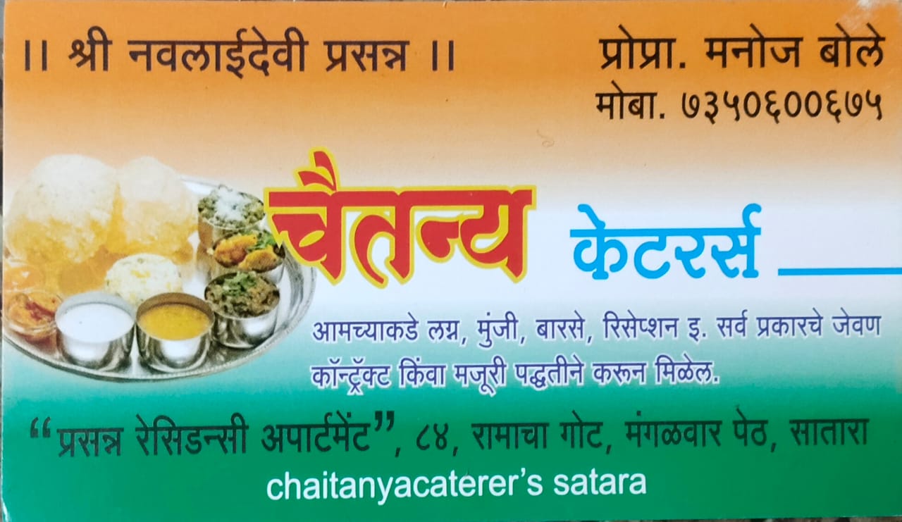 🥘🥘 स्वादिष्ट, रुचकर जेवणाची सोय 🥘🥘 शुभ कार्य तुमचे, मॅनेजमेंट आमचे. 🥘🥘 सर्व छोट्या मोठ्या समारंभासाठी शुभकार्यासाठी लागणारे केटरिंग मॅनेजमेंट उपलब्ध. 🥘🥘 वेटर कुक तसेच इतर सर्व साहित्यांसहित सर्व मॅनेजमेंट सेवा पुरविली जाईल. 🥘🥘 20 वर्षांची विश्वासणीय परंपरा. 🥘🥘 योग्य आणि माफक दर 🥘🥘 असंख्य समाधानी ग्राहक 🥘🥘 प्रशिक्षित आणि अनुभवी टीम 🥘🥘 एकदा अवश्य संपर्क करा. 🥘🥘 चैतन्य केटरर्स यांना संपर्क अथवा भेट दिल्याबद्दल धन्यवाद.