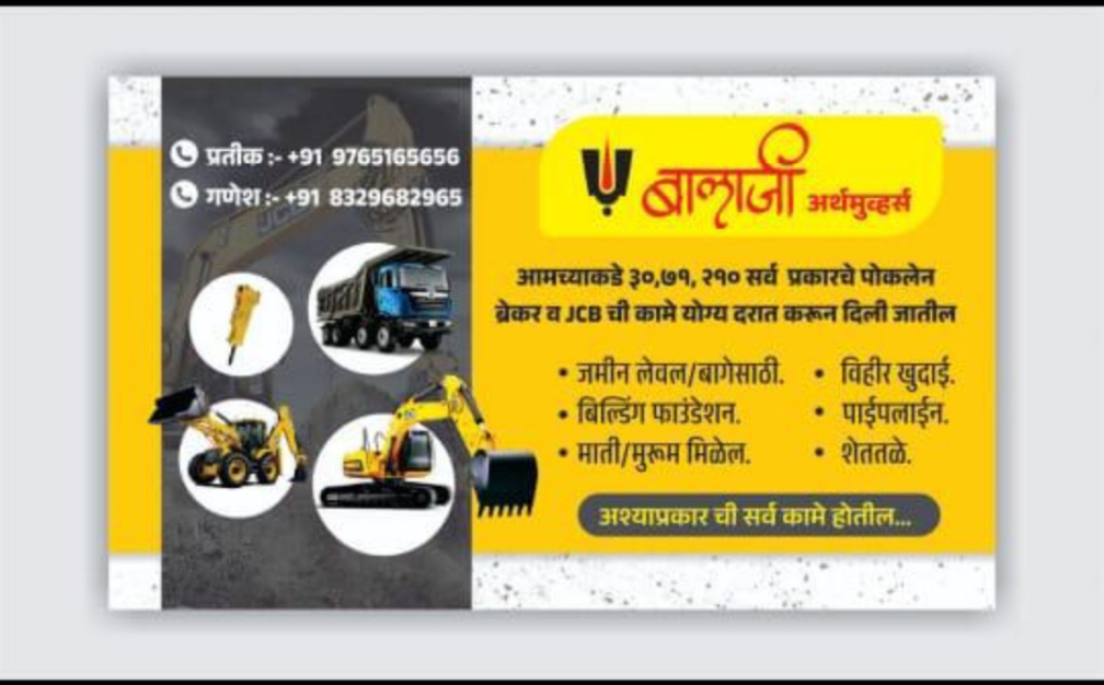 आमच्याकडे ३०,७१, २१० सर्व प्रकारचे पोकलेन ब्रेकर व JCB ची कामे योग्य दरात करून दिली जातील
