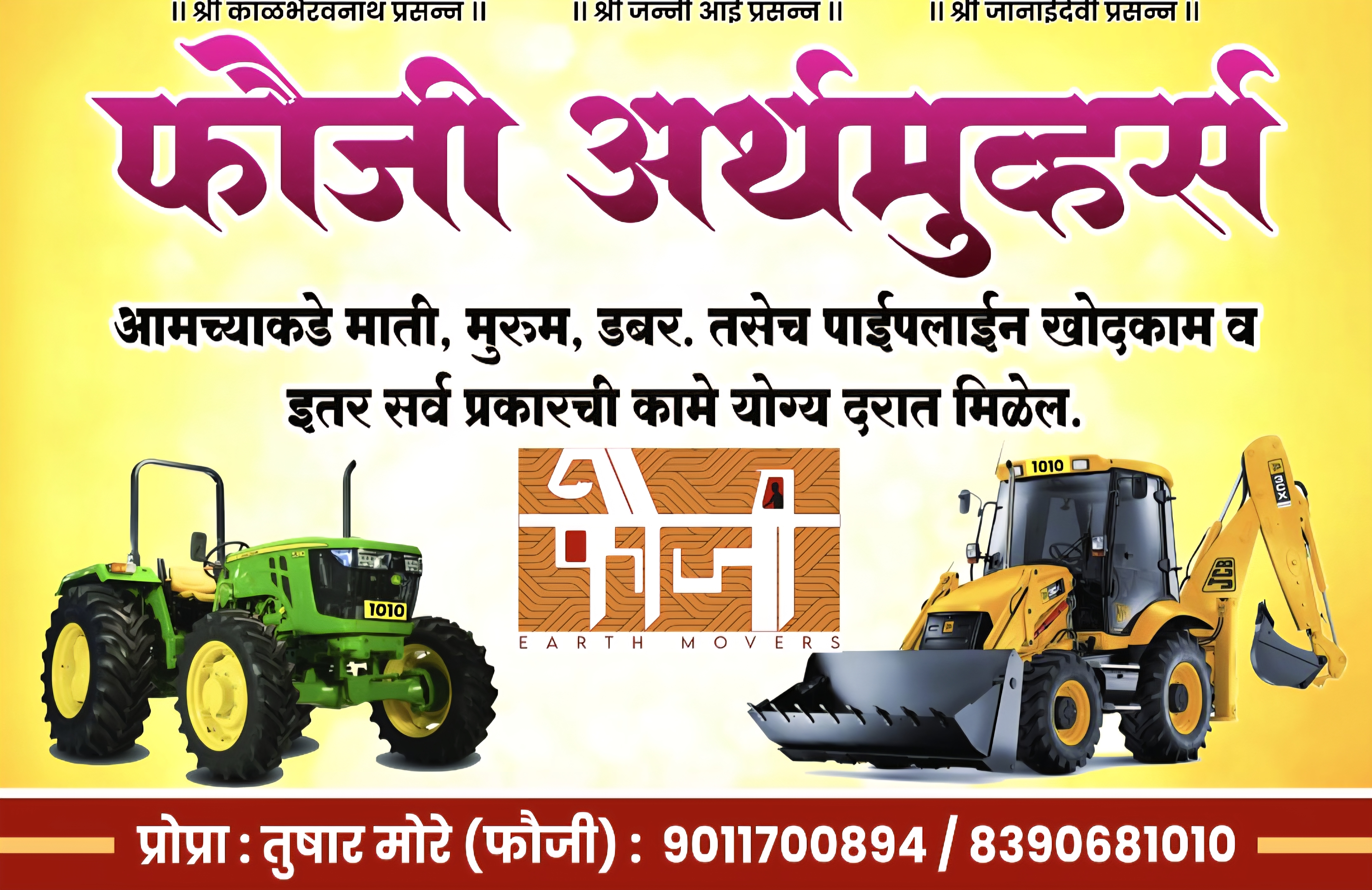 गाळ काढणे ,शेततळे ,जमीन दुरुस्ती तसेच जई काढणे. सर्व प्रकारचे लेव्हलिंग चे कामे योग्य दरात करून मिळतील. असंख्य समाधानी शेतकरी आणि ग्राहक वर्ग शेतीसाठी चारी खोदणे पाईपलाईन साठी खोदकाम करणे इत्यादीसाठी खात्रीशीर सेवा फौजी अर्थमूव्हर्स यांना भेट अथवा संपर्क केल्या बद्दल धन्यवाद. एक वेळ अवश्य संपर्क करा