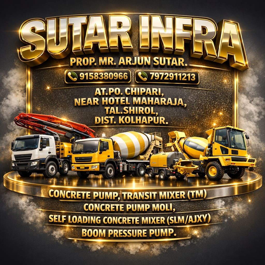 ЁЯПбSUTAR INFRA (Prop. Mr. Arjun Sutar) рд╣реА рдХреЛрд▓реНрд╣рд╛рдкреВрд░ рдЬрд┐рд▓реНрд╣реНрдпрд╛рддреАрд▓ рдПрдХ рдирд╛рдорд╛рдВрдХрд┐рдд рд╡ рд╡рд┐рд╢реНрд╡рд╛рд╕рд╛рд░реНрд╣ рдХрдиреНрд╕реНрдЯреНрд░рдХреНрд╢рди рдорд╢рд┐рдирд░реА рд╕реЗрд╡рд╛ рдкреБрд░рд╡рдгрд╛рд░реА рдХрдВрдкрдиреА рдЖрд╣реЗ. рдЖрдореНрд╣реА Concrete Pump, Transit Mixer (TM), Concrete Pump Moli, Self Loading Concrete Mixer (SLM/AJXY) рдЖрдгрд┐ Boom Pressure Pump рдпрд╛ рд╕рд░реНрд╡ рдЖрдзреБрдирд┐рдХ рдорд╢рд┐рдирд░реА рднрд╛рдбреЗрддрддреНрддреНрд╡рд╛рд╡рд░ рдЙрдкрд▓рдмреНрдз рдХрд░реВрди рджреЗрддреЛ.
